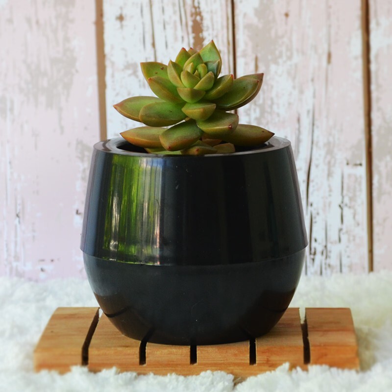 “La maceta se divide en 2 partes: en la parte superior se coloca el sustrato con la planta, y en la inferior el agua. Esto permite que las plantas se rieguen solas desde las raíces, tomando la cantidad de agua necesaria. Esto evita que la planta sufra o muera por falta o exceso de agua.” Medidas 9 x 10 (diámetro)